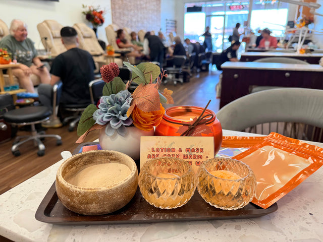 Immerse yourself in the cozy elegance of fall with our limited-edition Pumpkin Spice Pedicure — a seasonal indulgence as rich as autumn itself, with every sugar scrub, mask, and lotion freshly made in our salon — a signature touch you won’t find anywhere else in Texas.